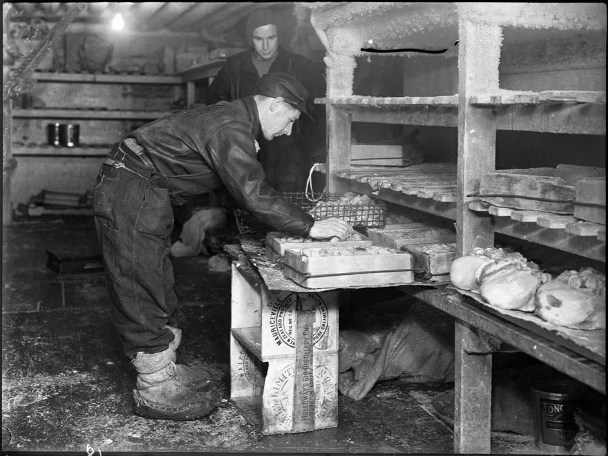 Workmen in the freezer, Longburn Freezing Works