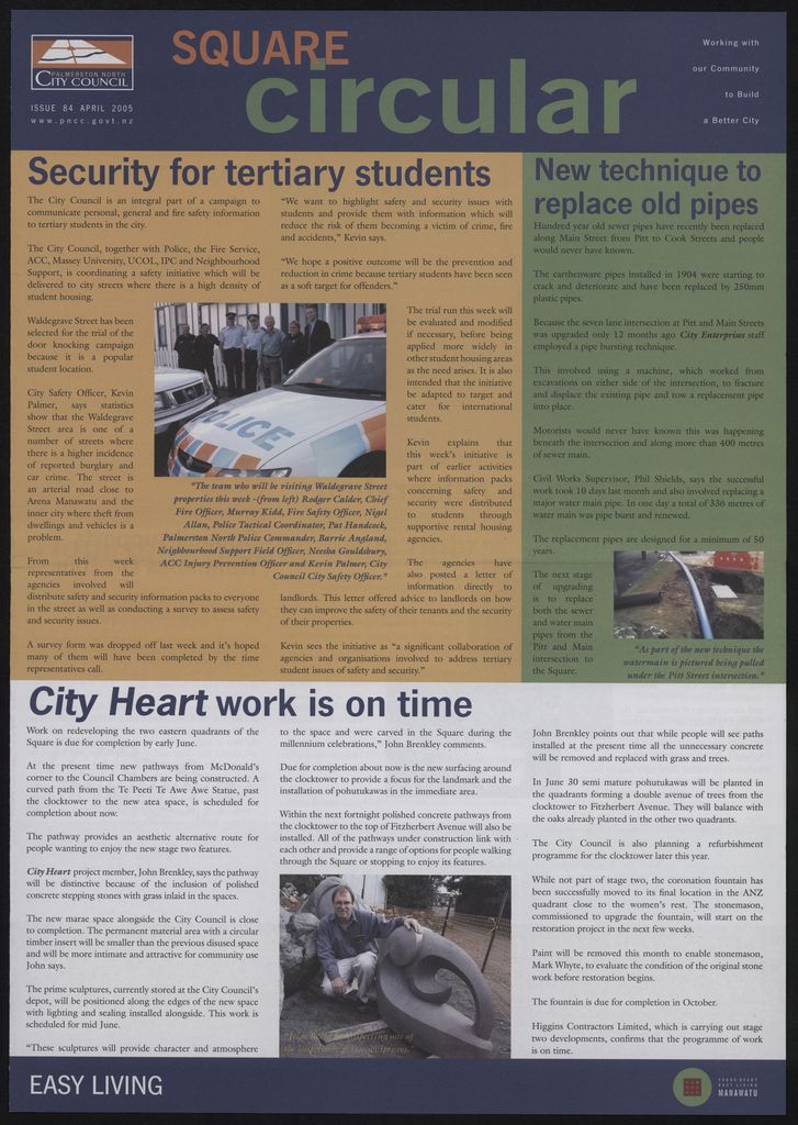 The Square Circular was Palmerston North City Council's monthly community publication, informing Palmerstonians of PNCC initiatives, activities, and events. This month's issue includes: Draft Annual Plan; Creating Our Future project; safety for tertiary students; sewer pipes replacement; City Heart; The Square; waste minimisation; shared pathway; Citizens Advice Bureau; archives; parking; graffiti removal; road marking; Palmerston North Performing Arts Trust; Square Edge exhibition; Te Manawa; Palmerston North City Brass