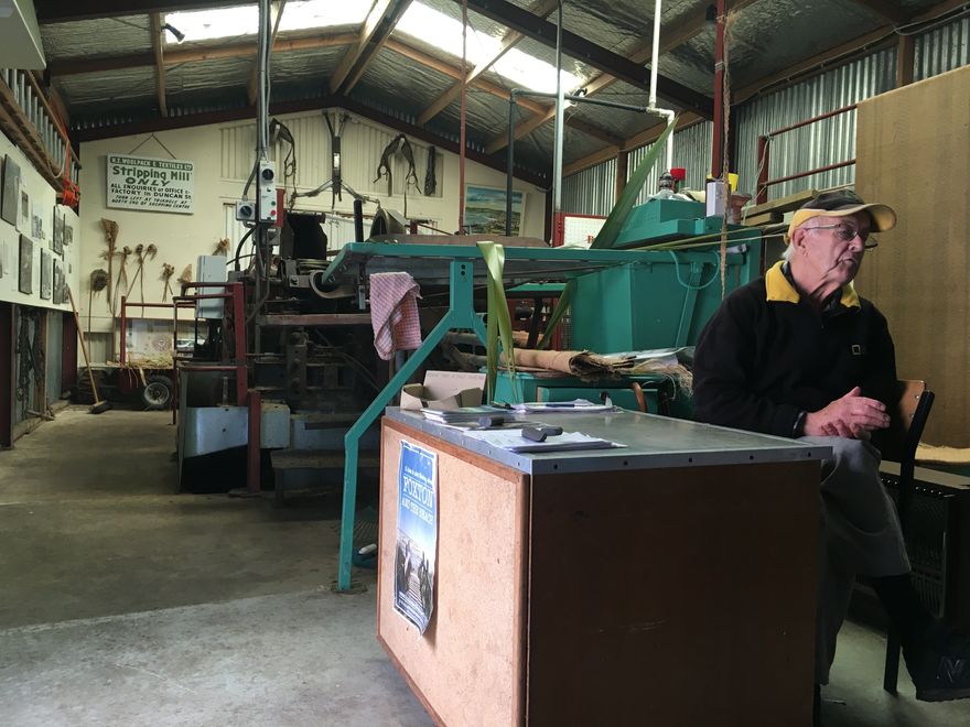Tony Hunt gives a run-down of the history of New Zealand’s flax fibre industry. Behind him is one of the few operational flax strippers remaining in New Zealand.