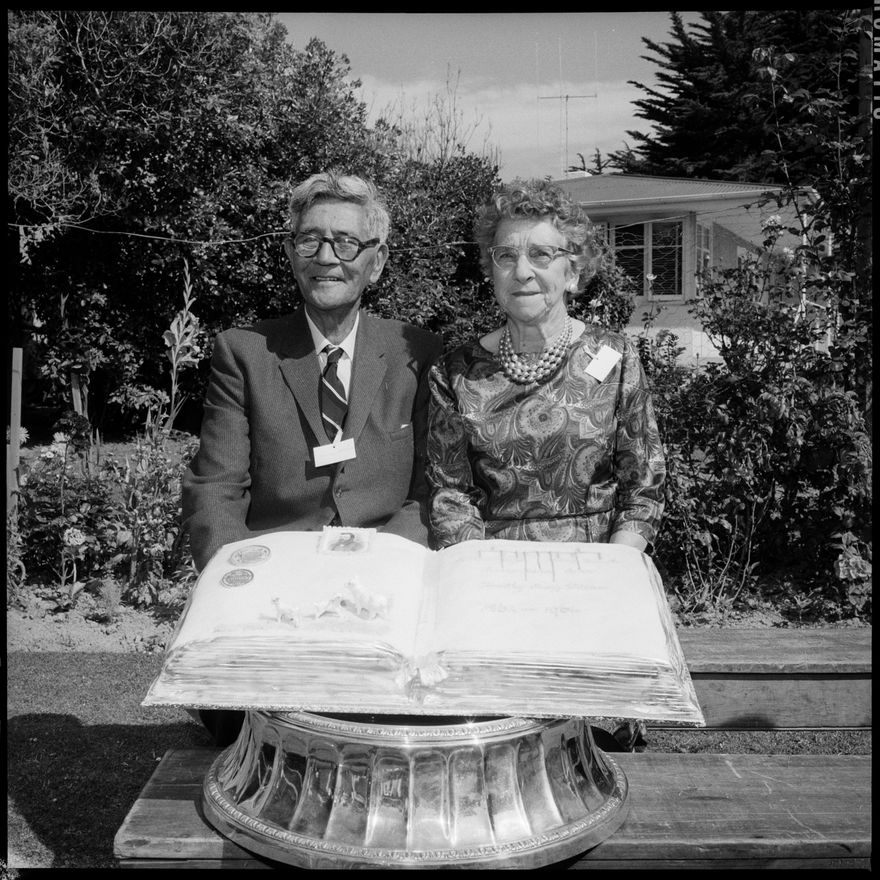 This image was not published in the Manawatu Evening Standard, taken on 20 January, 1964. [Mr David Rowland, of Worchestershire, England, arrived in New Zealand as an 1864 poineer. At the weekend, his descendants, 115 of them, were photographed as they celebrated their Dominion centenary in Longburn on Saturday. Mr and Mrs Timothy Rowland (last surviving son of David Rowland) are seen with the anniversary cake shaped like a book.] Another image of the couple was published on 20 January, 1964. See also: 2017N_2017-20_018338