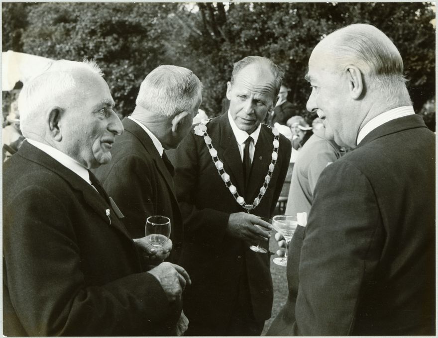 A garden party held for Palmerston North's old identities in the grounds of Caccia Birch. From left: Mr G Rennie (former Palmerston North Mayor), unknown, Mayor Desmond Black, the Governor General A Porritt. There were 350 guests in attendance.