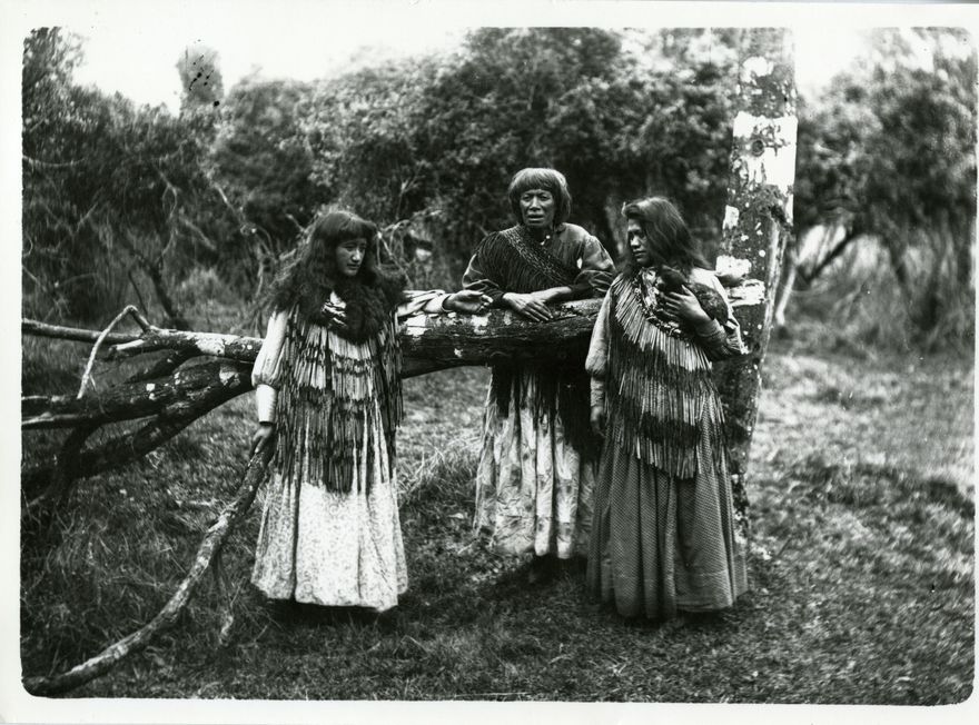 E ai ki nga korero e tata ana ki Shannon enei wahine. Three women, two in Maori cloaks, said to be at a place near Shannon. To access image please contact us.