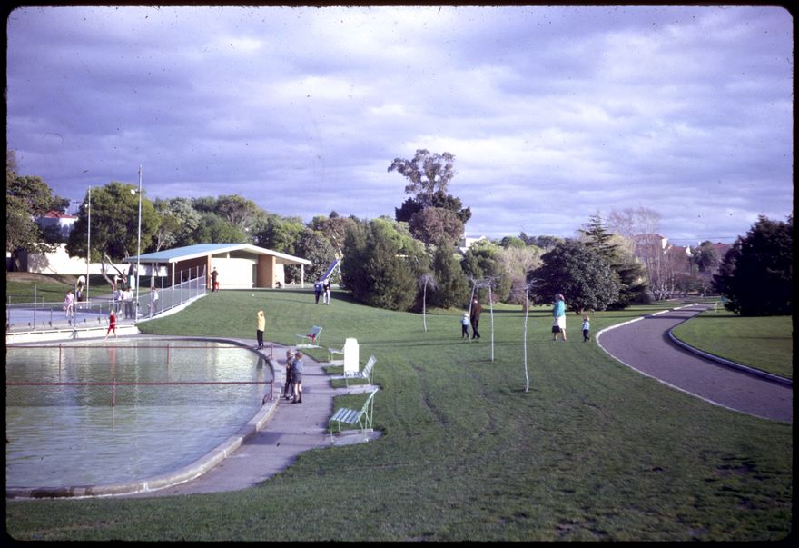 Memorial Park (previously named Fitzroy Park) at Terrace End, was formerly a metal pit used by the Railways Department for ballast, from about 1876-1937. The Palmerston North City Council purchased the 21 acre site in 1938 and developed it into a recreational and sporting area. A WWII memorial was erected 1952 and in 1954 Fitzroy Park was officially dedicated as Memorial Park. In 1983 the obelisk was removed and now the gates stand as the official memorial. Photograph was published in The Tribune 20 April 1975.