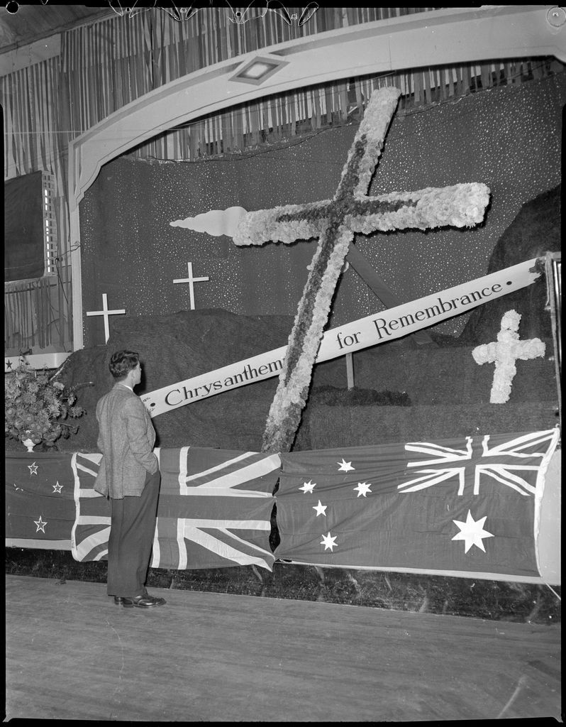 This image was taken for a story that ran in The Manawatu Evening Standard on 30 April 1958, page 5: "The cynosure of the large numbers who attended the Palmerston North Horticultural Society's chrysanthemum show, yesterday, was this outstanding exhibition of chrysanthemums arranged in the shape of a cross. The cross was formed by the garden circle of the Y.W.C.A., with the aid of Mr. D. Keen."