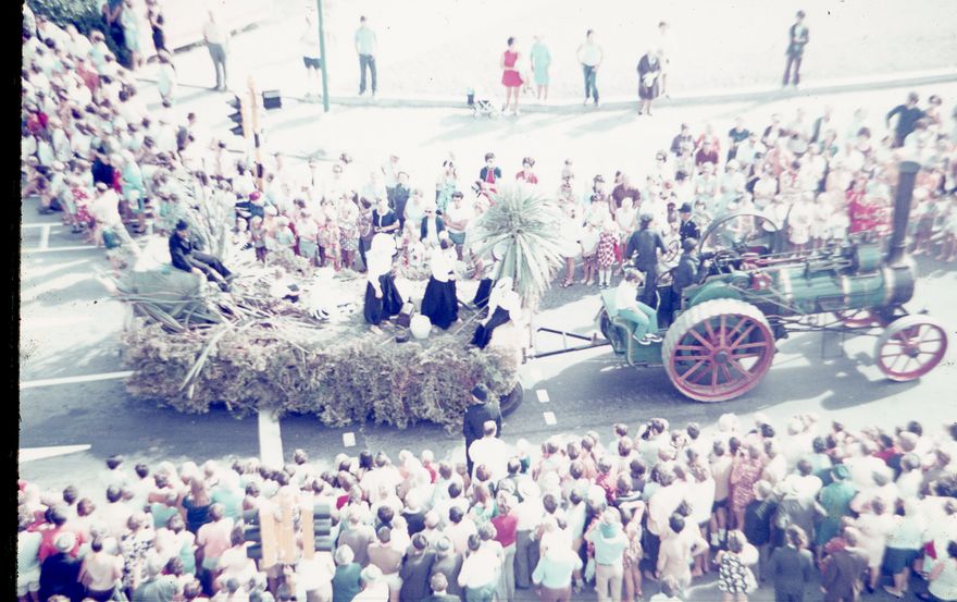 This image compliments a story that ran in The Manawatu Evening Standard on 14th March 1971 [People are dressed in historical costumes, on a trailer covered in native greenery, being pulled by a traction engine along the street. The roadway is lined with spectators.]