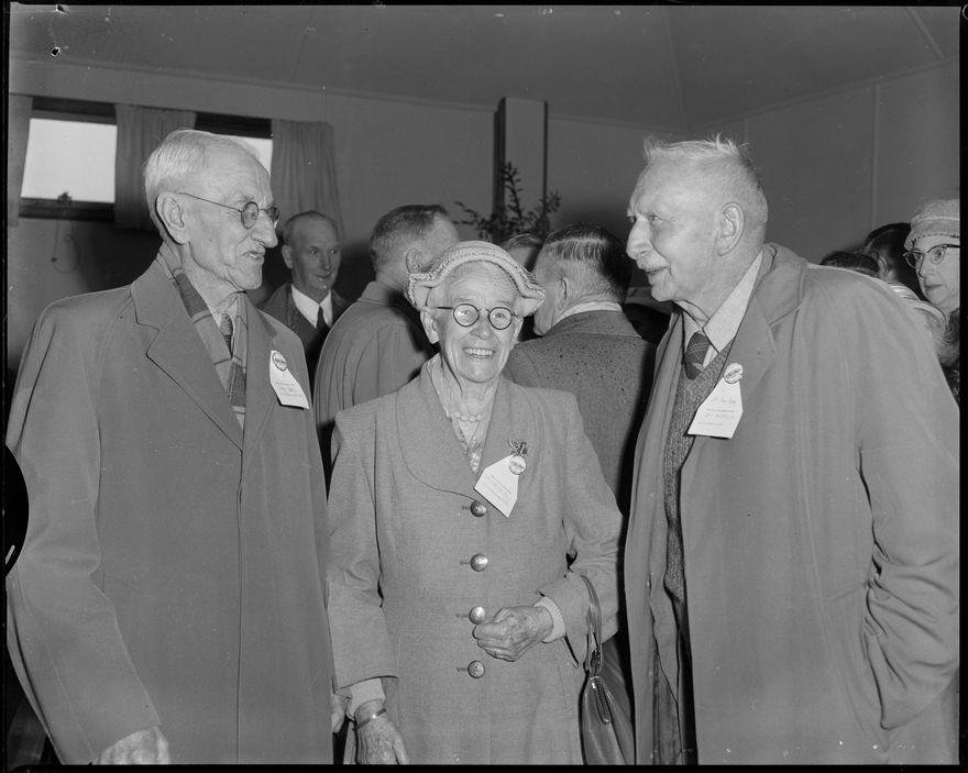 This image was taken for a story that ran in The Manawatu Evening Standard on 30 May, 1959. "Chatting over the memorable events of 70 years ago when they attended the Mangatainoka School together as neighbours in Short Road are three of the eight first-day pupils who attended the 70th Jubilee celebrations of the school yesterday. From left they are Mr R. Bly (Woodville) and his sister, Mrs M. Davis (Paekakariki), and Mr P. C. Peterson (Pahiatua)."