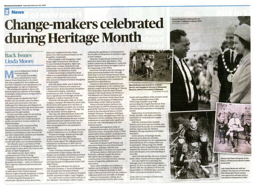 Local historians weekly "Back Issues" article in the Manawatū Standard. Local History Week and History Month this year is inspired by the whakatuakī (proverb) "Hāpaitia te ara tika pūmau ai te rangatiratanga mō ngā uri whakatipu". During the month of March, a focus will be on people, kaupapa and organisations from the past that have made an impact on the city. Changemakers and thought leaders will be highlighted, with more than 80 heritage activities presented and hosted by 50 organisations and individuals.