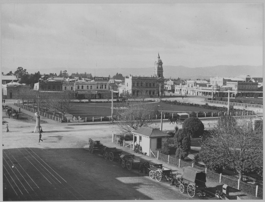 This photograph looks out over The Square towards the old Post Office. The small structure behind the line of carts and carriages is a taxi stand. The street that bisects the photograph horizontally is Rangitikei Street, which used to run in to The Square as far as Main Street.