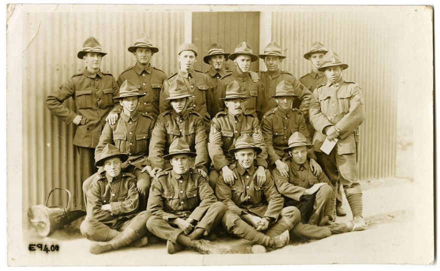 - A group of sixteen soldiers pose outside a corrugated iron building.