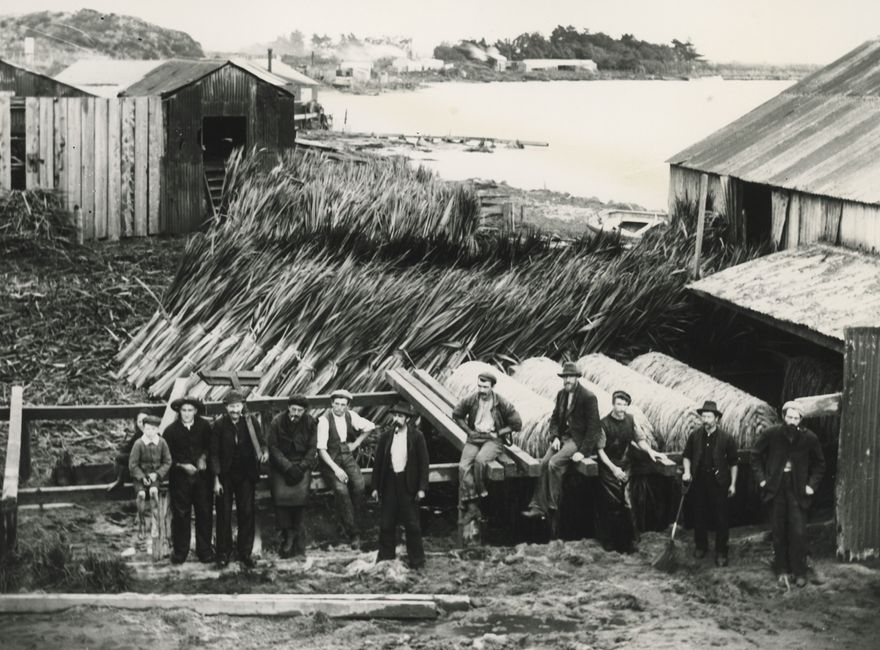Coley’s mill stood in Harbour Street, Foxton, by the Manawatu River. The photograph shows cut and processed flax.