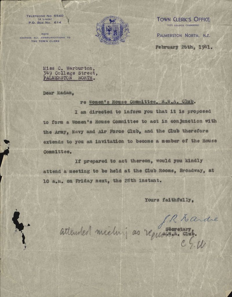 Letter to Charlotte Warburton, Chairwoman of the Palmerston North Women's War Service Auxiliary, requesting attendance at a meeting to form a Women's House Committee in conjunction with the Army, Navy and Air Force Club. From J R Hardie, Secretary of the A.N.A. Club.