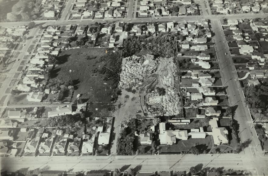 Ruahine Street runs along the bottom of the photograph, with Church Street on the left. Ferguson Street is to the right. Rostrata' maternity home can be seen on the corner of Ruahine and Ferguson Streets at the top left. In the centre of the block can be seen Jensen's Pit, which was then being filled in.