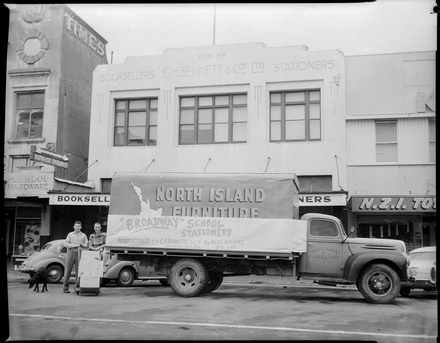 Photograph of a North Island Furniture truck with a promotional banner advertising "Broadway" School Stationery, parked outside the G.H. Bennetts bookshop in Broadway Avenue. Two men have a trolley jack loaded with boxes of stationery.