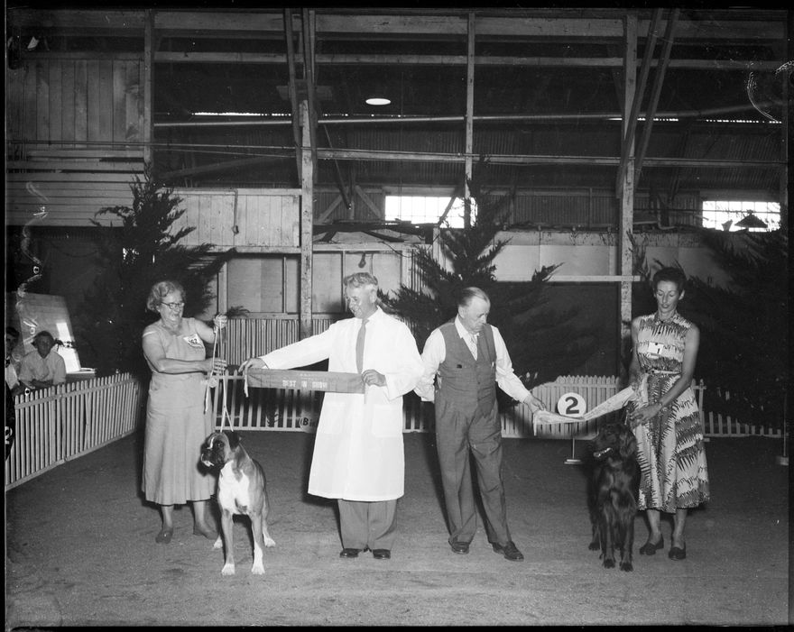 This image was taken for a story that ran in The Manawatu Evening Standard on 10 March 1958, page 6: "At the Manawatu Kennel Club's autumn show on Saturday Mr. and Mrs. G.I. Beeson's boxer was judged the best dog in the show and Mrs. R.M. Cuming's Irish setter the runner-up. Those in the picture from left are: Mrs. Beeson, Messrs. A. Fraser (Dunedin) and J. Robson (Wellington), the two judges, and Mrs. Cuming."