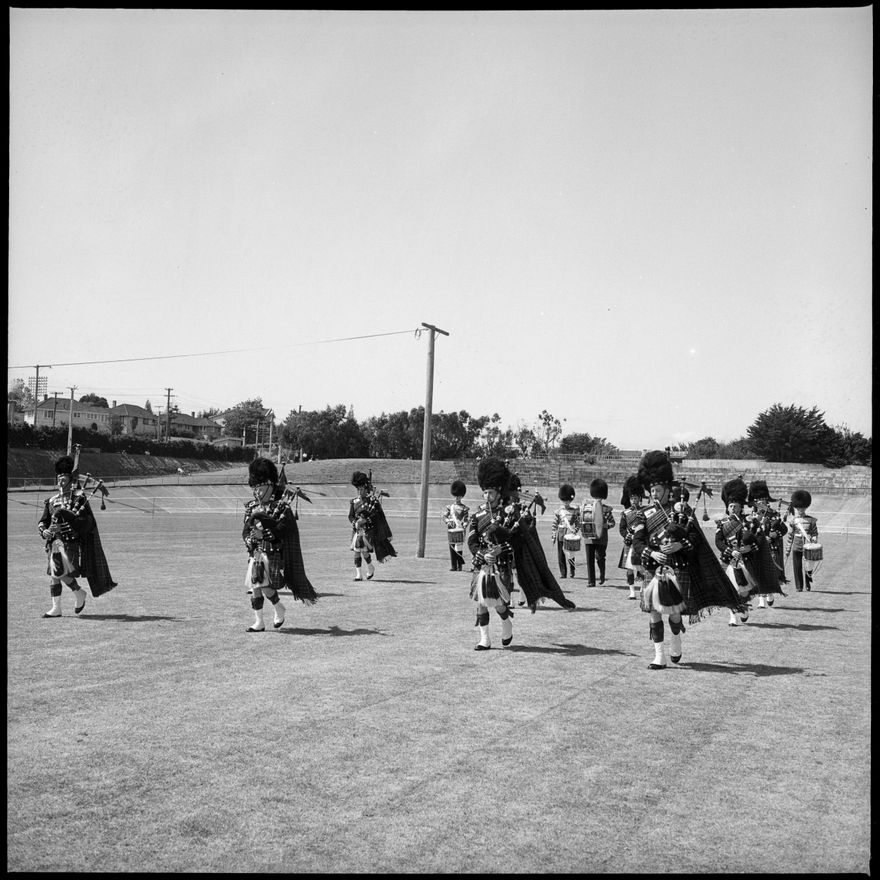 This image was not published in The Manawatu Evening Standard, taken on 6 February, 1964. "The drummers of the First Battalion of the Scots Guards in their immaculate uniforms at the rear of the pipers playing on the march at the performance at Memorial Park yesterday. In the background is the large audience of post-primary school children and adults." Another image of the performance was published on 6 February, 1964.
