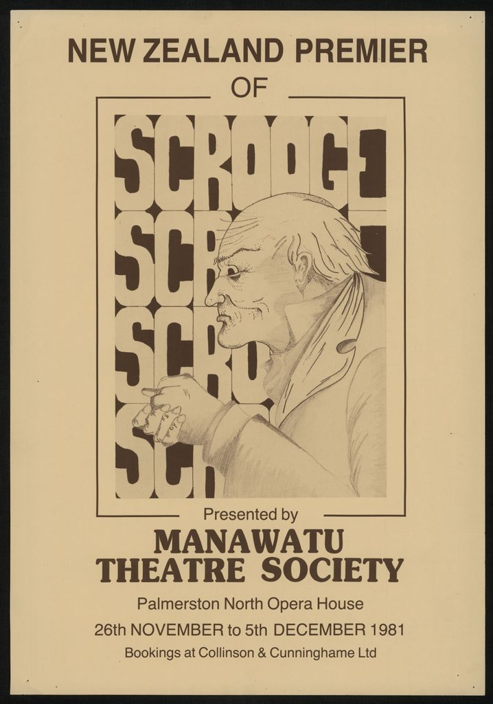 "New Zealand premiere of Scrooge. Presented by Manawatu Theatre Society. Palmerston North Opera House. 26th November to 5th December 1981. Bookings at Collinson & Cunninghame Ltd." Part of a collection of posters that were displayed in the Public Library in the 1970s - 1980s.