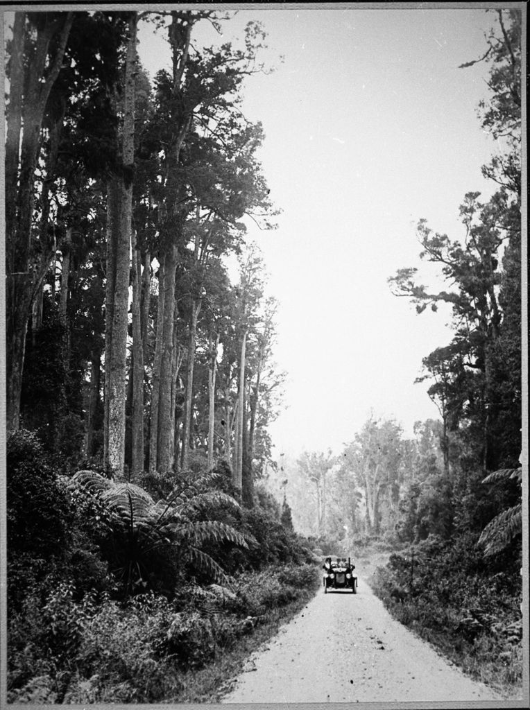 "Totara Reserve" is the popular name of the 740 acre public reserve situated on the east bank of the Pohangina River and officially known as Pohangina Valley Domain. Since 1947, this reserve has been owned by the Palmerston North City Council. This photograph shows one of the early motor cars of the Pohangina Valley (possibly owned by Evaline Clink) travelling along the metalled road through the reserve. The ownership of the car is unknown. The photographer is Charles E Wildbore (1862-1937), who came to New Zealand from England in 1874. He was a bee keeper, dairy farmer and a well-known amateur photographer in the Pohangina Valley during the period 1890s-1920. He married Jane Emily Dallison in 1888 and they had 13 children.