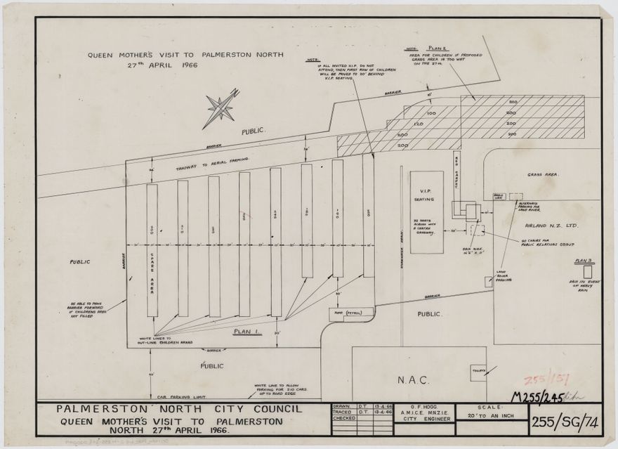 Layout for the reception at Palmerston North airport, on the visit of Queen Elizabeth, the Queen Mother, to Palmerston North.