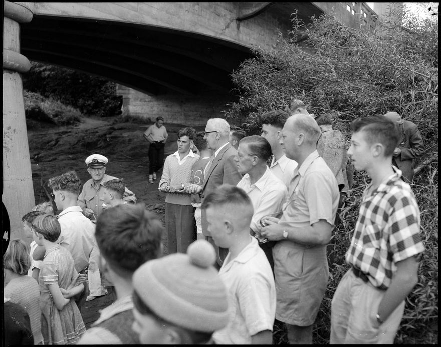 This image was taken for a story that ran in The Manawatu Evening Standard on 27 December 1958: "The Mayor of Palmerston North (Mr. W.B. Tennent, M.P.) sends off the first competitor in the annual Fitzherbert Bridge to Foxton Beach river race. N. Longman was the first off, and had a 20min lead over the next starter."
