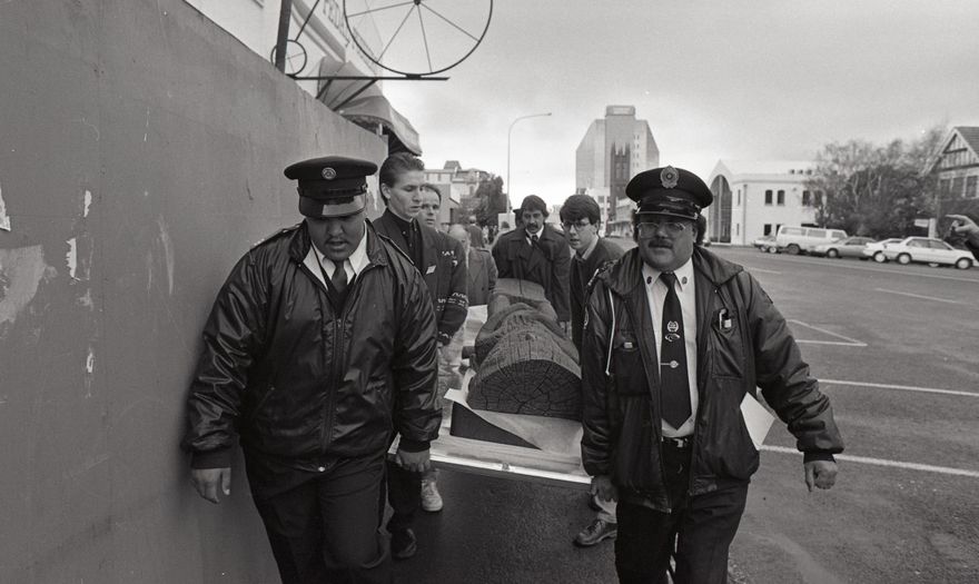 This image was taken (but not used) for a story that ran in The Manawatu Evening Standard on 4th August 1993. "The air was thick with emotion when four Rangitāne pouwhenua (carved stockade posts) were returned home yesterday after an absence of 60 years. Originally from Puketotara Pa, the pouwhenua were considered significant and important taonga for the Rangitāne people. They were the only large Rangitāne carvings still in New Zealand, and four of seven in existence. In 1933, Wiremu Kingi Te Awe Awe presented the carvings to the then Dominion Museum for safekeeping. There they were displayed in the Māori Hall for many years. Today, a delegation from the Museum of New Zealand, Te Papa Tongarewa, led by board chairman Sir Hamish Hay and Māori art and history director Cliff Whiting, handed over the carvings on a permanent loan basis to the Manawatu Museum. They will form a major component of the exhibitions in the new Manawatu Museum - Science Centre, opening in February next year. Mr. Whiting said the decision to return the carvings to their area of origin was part of the New Zealand Museum's policy of partnership with other museums. [Pictured] One of the four Rangitāne pouwhenua, returned to the Manawatu yesterday, is unveiled in preparation for transportation to a wing of the Museum's new premises."