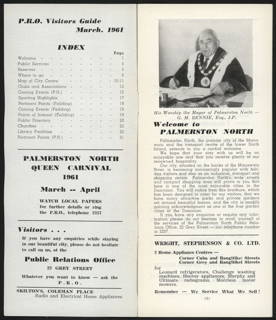 An informational booklet published monthly by the Palmerston North Public Relations Organisation (Inc.) to provide information for visitors to Palmerston North and Feilding. Includes statistics about infrastructure and demographics.