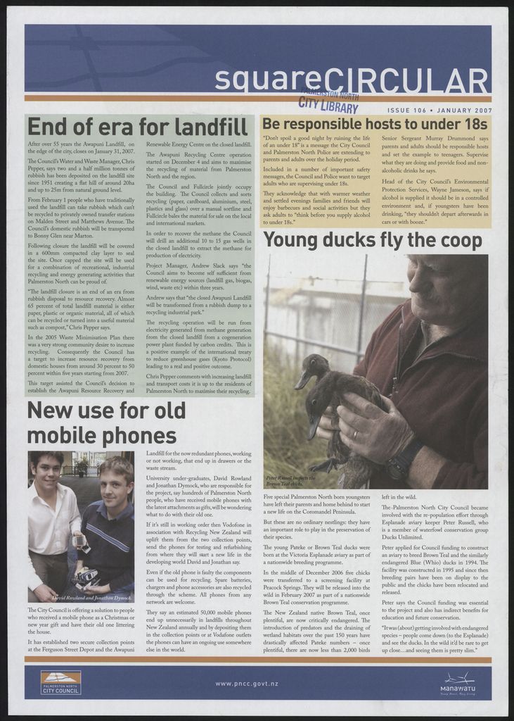 The Square Circular was Palmerston North City Council's monthly community publication, informing Palmerstonians of PNCC initiatives, activites, and events. This month's issue includes: Airport, alcohol safety, aviary, Awapuni landfill, bus terminal, Celaeno Park, draft annual plan, Memorial Park, recycling, Regent Theatre, shared pathways, Style Manawatū magazine, sunsmart, Victoria Esplanade, walkways.