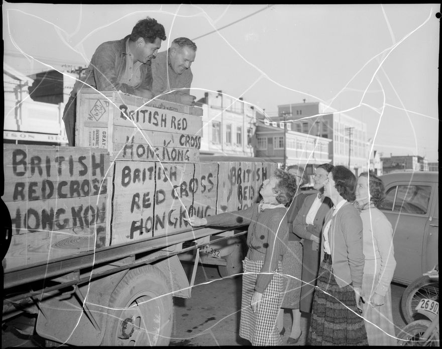 This image was taken for a story that ran in The Manawatu Evening Standard on 28 July 1961 "Carriers have a friendly word with Red Cross workers after loading a number of cases of clothing for the needy in Hong Kong. Miss L. Wimsett, the secretary of the Manawatu Centre of the New Zealand Red Cross Society, points out the destination of the cases before they left the society's rooms in Cuba Street yesterday."