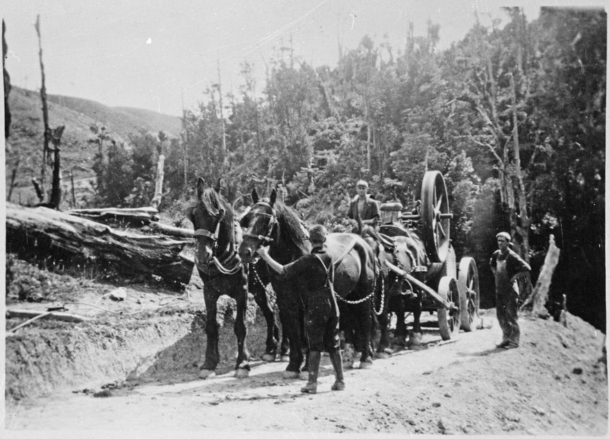 W H Foot's sawmill at the top of Forest Hill Road, Fitzherbert East, was probably the last mill operating on the northern Tararuas. It was erected in 1920 and operated until about 1927. The mill was situated on what is now Mr Don Scott's property. In the photograph, Mr W H Foot is standing on the right, while his son Lionel Foot is driving (centre) and another son Harold is holding the horses (left).