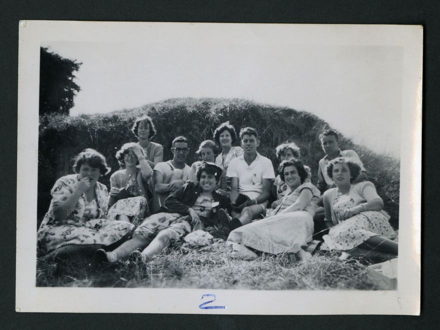 Bible Class annual conference held at Dannevirke. Manawatu group at the picnic at the Manawatu River. From left. At front: Jeanette Baillie; Elayne Thompson; Beth Thompson; Joy Beagley (of Woodville). Behind: Judith Dunlop (hand on head); Kath Bott; Bevan Halwey; Isabel Pilkinton; Jean Cotter; Maurice Thompson; Jo Port; John Pringle.