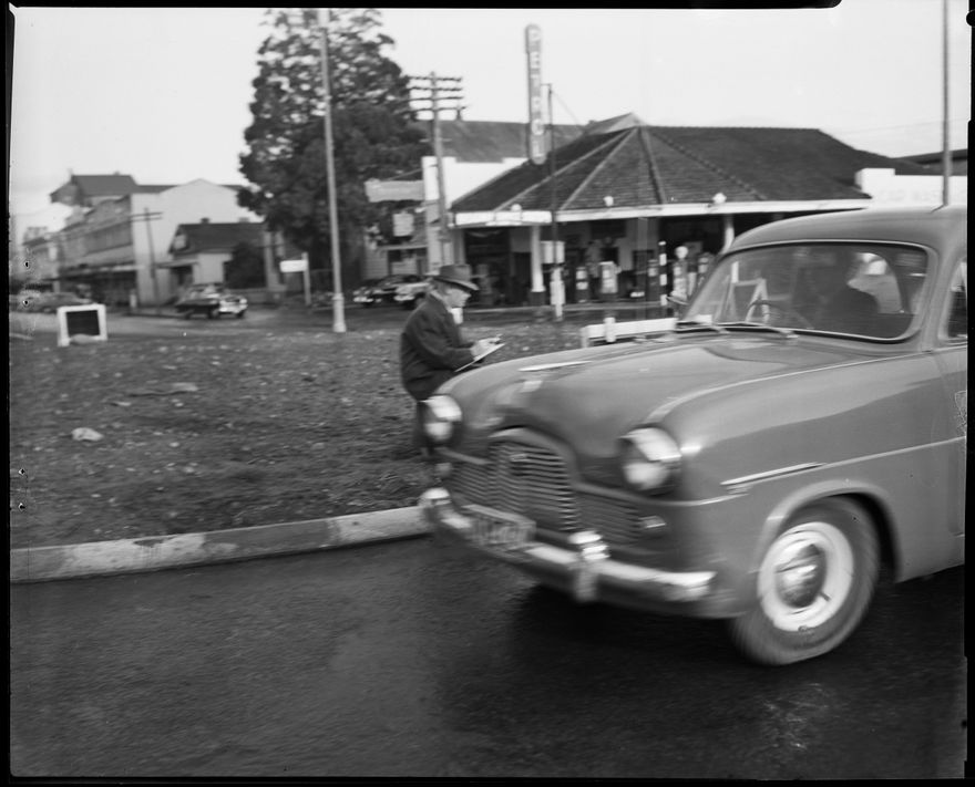 This image was taken for a story that ran in The Manawatu Evening Standard on 10 July 1958, page 10: "The use and efficiency of the round-about at the intersection of Broadway and Princess Street was checked by the engineer's assistant of the Transport Department (Mr. S.W. Pierce) today. During the lunch period, from noon until 1.15 p.m., Mr. Pierce charted the number of motor-vehicles and cycles using the round-about. A similar check was made at the intersection prior to the installation of the round-about, a further one when the temporary project was installed and the final one was being made today. Traffic was flowing smoothly and few delays were noted. The checks would be of interest to other centres contemplating the installation of similar safety projects."