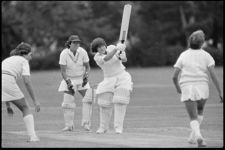 Penny Kinsella at bat. This image was taken (but not used) by the Evening Standard on 19th of January 1982. It depicts Manawatū Women’s cricket team taking on the International Australian Women’s team in a limited over warm-up match for the Hansell's Vita Fresh Women's World Cup 1981/1982. The match was held at Ongley Park in Palmerston North. The Australian team won by 202 runs. The match report ‘Aussies too polished in all facets’ was written by Ford Watson and published the next day: