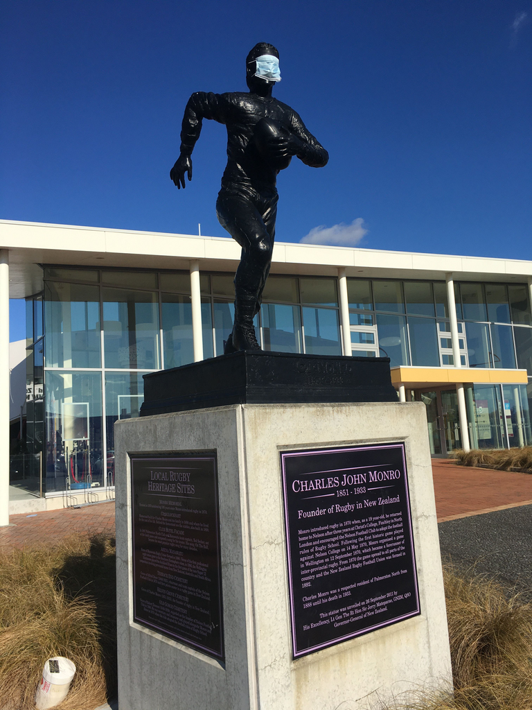 During the COVID-19 pandemic a face mask was places on the statue of Charles John Monro outside Te Manawa Museum of Art, Science and History.