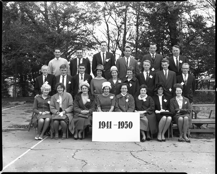 A group of about twenty former students attend the Linton School Jubilee. This negative comes from the Elmar Collection - a large series of semi-identified and unidentified images from the 1930s-1970s.