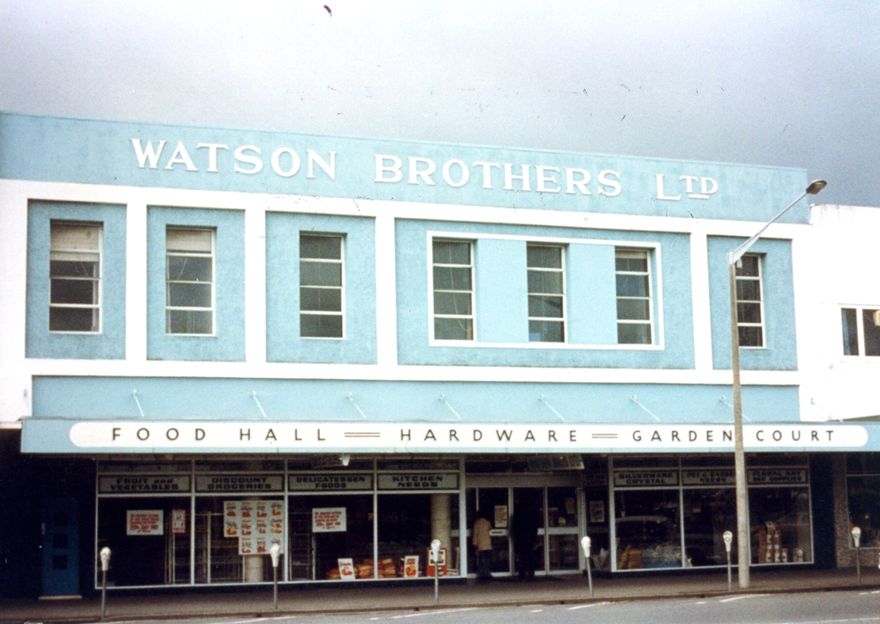 Watson Bros commenced in the early 1860s as the "Ready Money Store" which in turn was purchased by Joseph Nathan & Co Ltd. In succeeding years it became part of Manawatu Farmer's Co.op Assn Ltd, then Farmers Alliance Co finally the United Farmers Co.op Ass. When this business went into liquidation in 1910, the drapery side was purchased by W F Durward & Co. who removed it to the site of what is now the Plaza Mall. The remaining portion of the business - grocery, hardware, crockery and produce departments - was purchased by John and Thomas Watson of Timaru, and began trading as Watson Brothers Ltd.