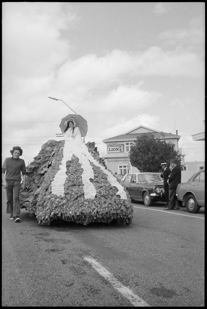 "... with skirts ruffling in the breeze Elizabeth Harris perches on her high seat on the WDFF float."