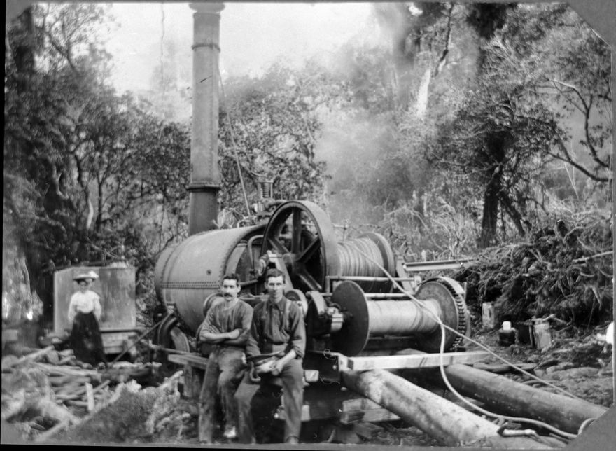 Two workmen and a woman at a milling point in the Apiti District. The portable steam engine driven winch, known as a log-hauler, hauled the logs from the bush to the tramline or bush railway, from where horses hauled the logs along the tramline to the sawmill.