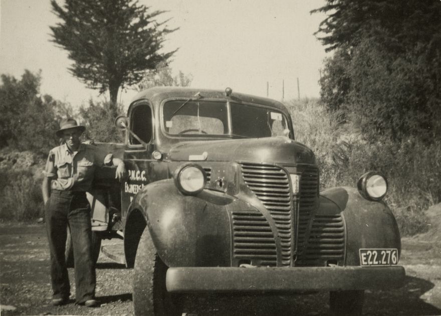 Ron Everleigh, truck driver, employed by the Palmerston North City Council standing alongside an Engineers Department truck.