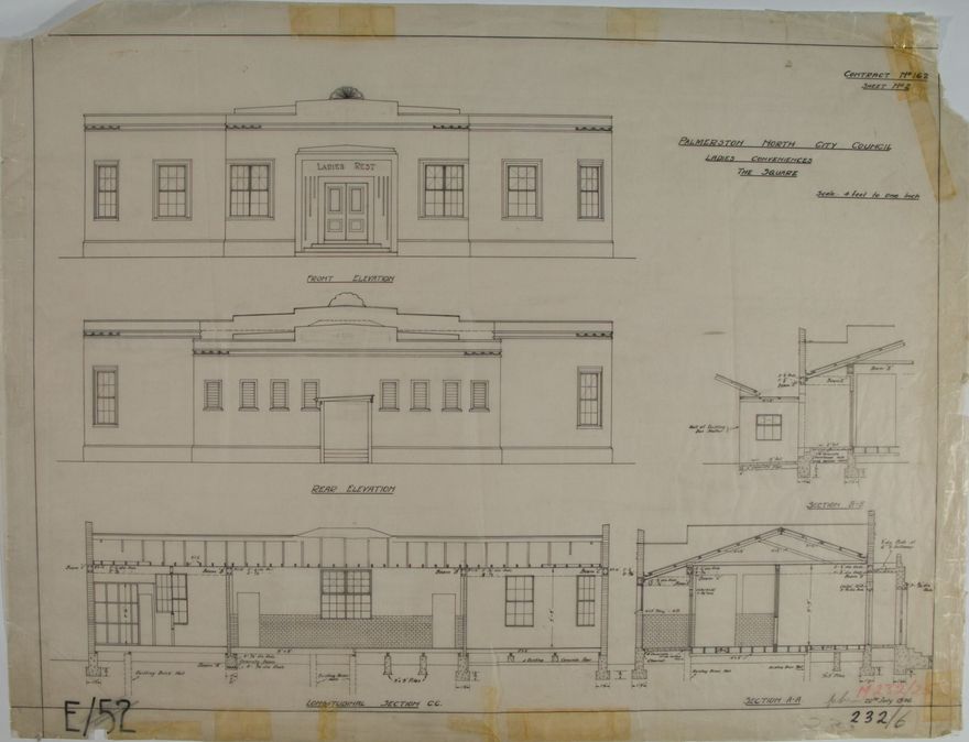 A plan of the "Ladies Conveniences - The Square". This is one of the original architect's plans drawn up by Palmerston North City Council staff for the construction of a new ladies toilets, built on the site of an earlier building from 1918. The Ladies Rest building is in the Art Deco style and remains standing today with some changes. The plan shows front and rear elevations and two longitudinal sections showing some details of the construction. Scale 4 feet to 1 inch.