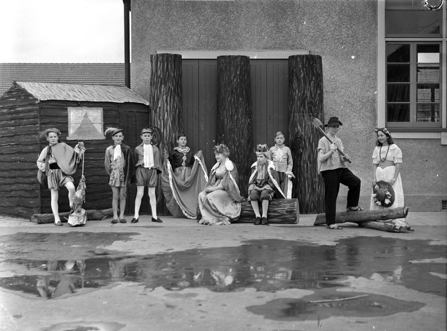 These children appear to be taking part in a theatrical production. Pictured are a king and queen, several pages, a woodsman and a fair maiden.
