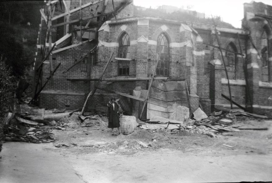 On the 3rd of February 1931, Napier experienced a disastrous earthquake, which resulted in damaging or destroying nearly every building in the city, with fires to follow. A woman stands outside a badly damaged church building.