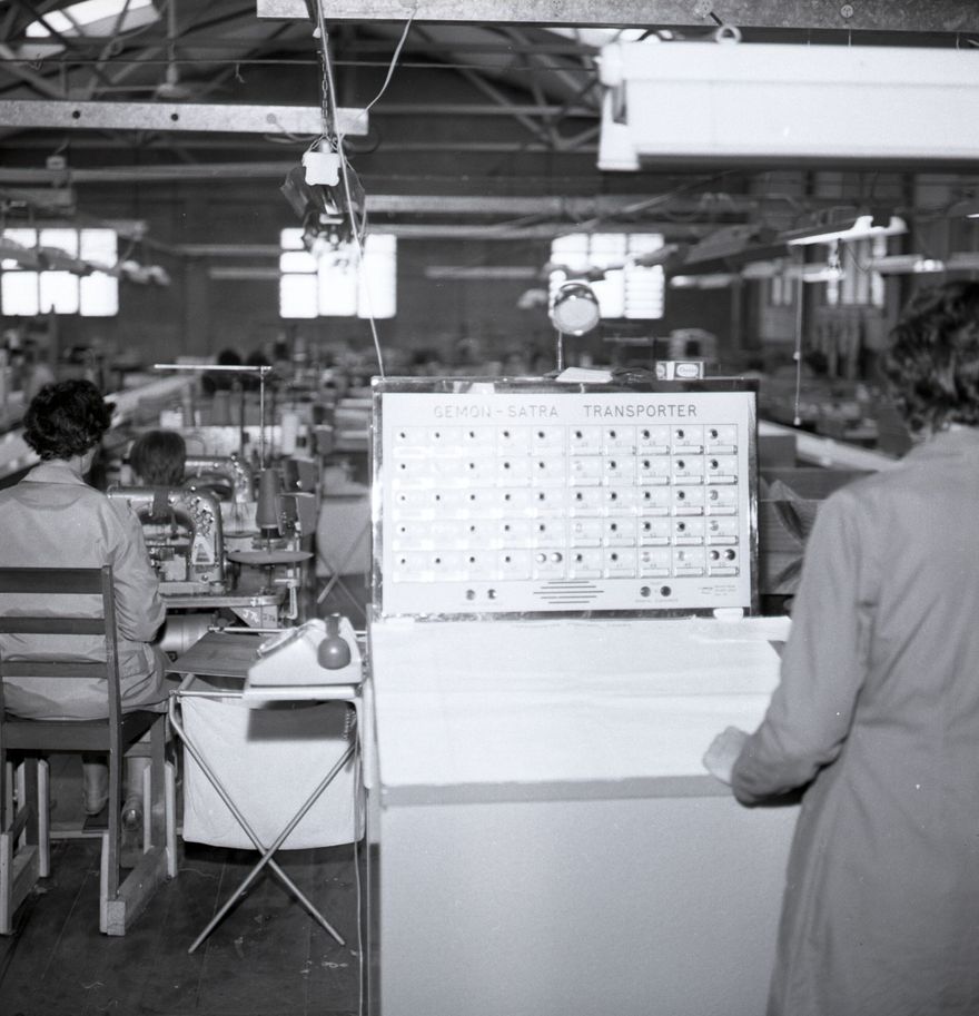 This photograph shows the interior of Jacquard Hosiery Mills Limited, including machinists sitting sewing machines. The Jacquard Hosiery Mills Ltd, were knitters of underwear and outerwear, that went under the brand name 'Jacquard. The mill was situated at 601 Featherston Street, Palmerston North. Published in the Manawatu Evening Standard 12 February 1968.In the 1967 Palmerston North phone book the factory is listed as Jacquard Hosiery Mills Limited at 601 Featherston Street. Personnel included General Manager V Kraak, Manager W.V. Hobbs and Secretary M F Ryder.
