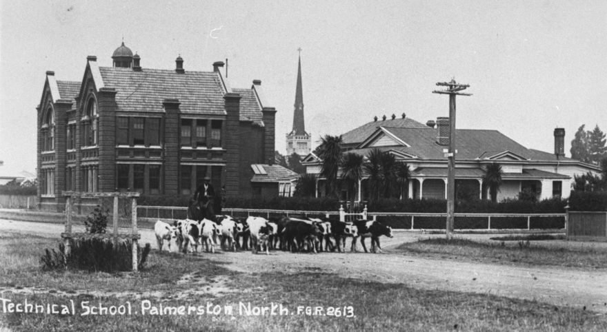Cattle are being driven along Duke Street (now Princess Street) past the Technical School, to the saleyards in Rangitikei and Grey Streets. Situated on the corner of King and Duke Street, the main buildings and workshops of the Technical School were opened 1909. After closing in 1956 the building has been occupied by the Teachers' College, the Palmerston North Technical Institute, and most recently the Universal College of Learning (UCOL).