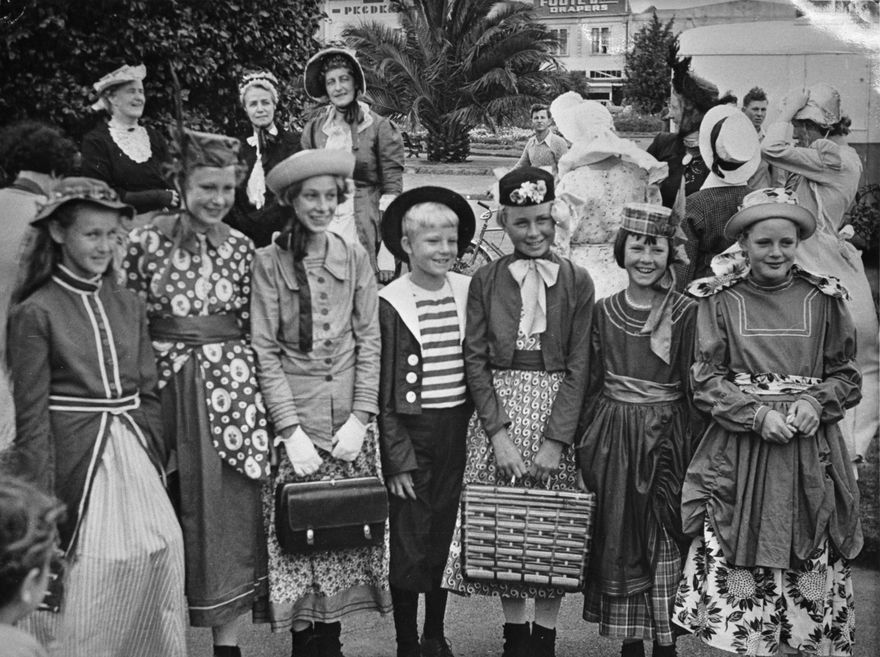 Dressed in period costume ready for the parade as part of the celebration of 75 years of the Palmerston North. In foreground: ? Milner (3rd from right); Ray Hatwell (4th from right). The three costumed women at the left rear are Miss C Boddy, unidentified and Miss E Foster, members of the Palmerston North Business Girls' Club.