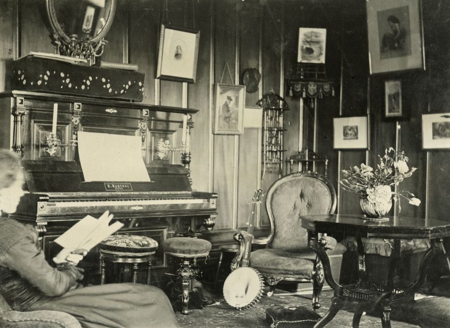 Mrs A S Aldrich is seated on left, in the drawing room of “Matsubara” the Aldrich family property. The “Matsubara Homestead” of Mr G H Aldrich was located two miles out of Bunnythorpe, on the Bunnythorpe – Ashhurst Road. The homestead was built about 1888 and destroyed by a fire in the late 1910s.
