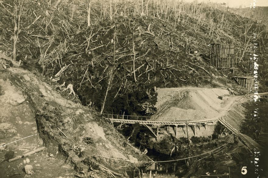 One of a series taken by Charles Wildbore between 1922 - 1924, recording the construction of the Mangahao electric power scheme. The power house was constructed at the foot of the ridge in the centre distance (to the right of the woooden building on stilts). The route along which the pipe line was constructed can be seen extending from the top of the ridge to the power house site. The Mangahao Power Station is a hydroelectric power station near the town of Shannon, Horowhenua. After being delayed by World War One, access roading and foundation testing was started by late 1919 and the station opened in November 1924. It makes use of Mangahao River, through a series of tunnels and piplines totaling 4.8 kilometers, in the Tararua Ranges. Mangahao Power Station became the power station for Wellington, Horowhenua, Taranaki, Hawkes Bay, and the Wairarapa. As of 2012, it is jointly owned and operated by Todd Energy and King Country Energy.