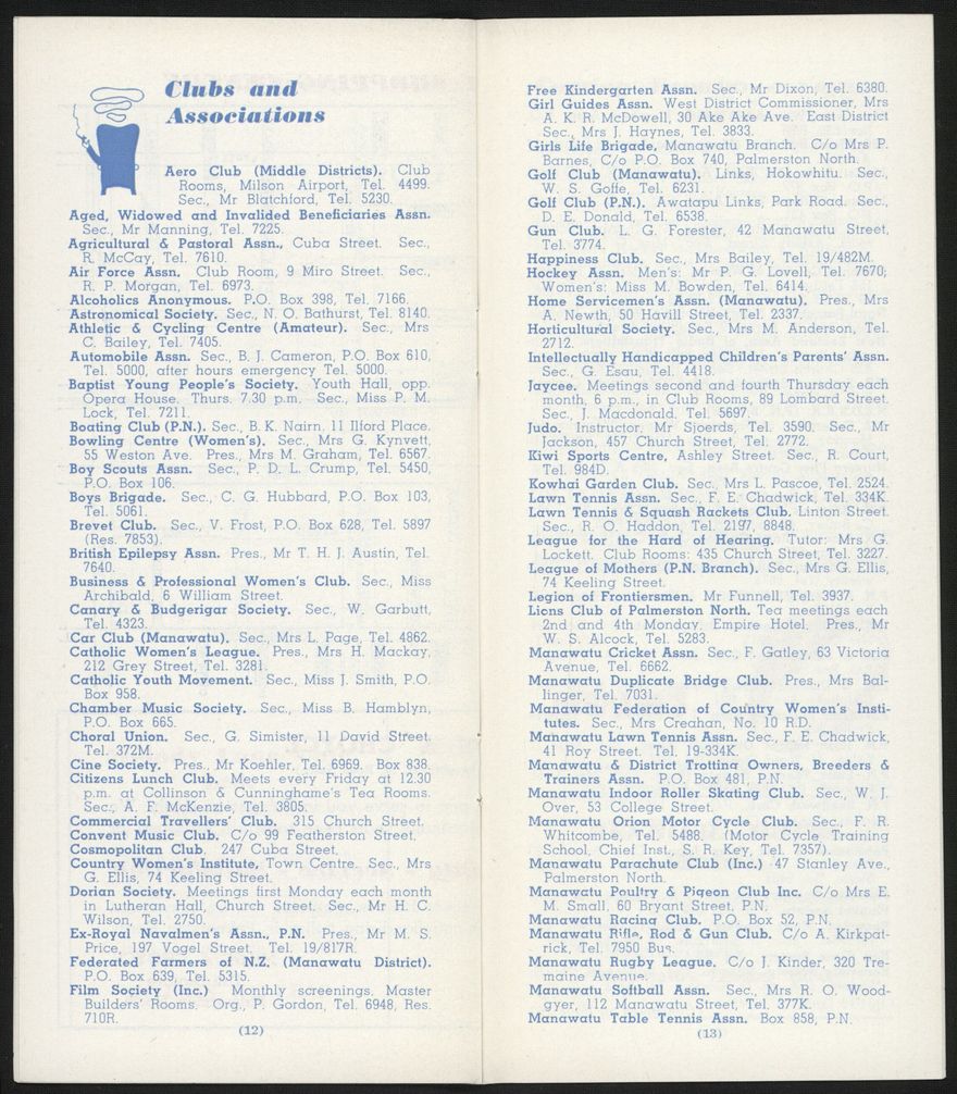 An informational booklet published monthly by the Palmerston North Public Relations Organisation (Inc.) to provide information for visitors to Palmerston North and Feilding. Includes statistics about infrastructure and demographics.