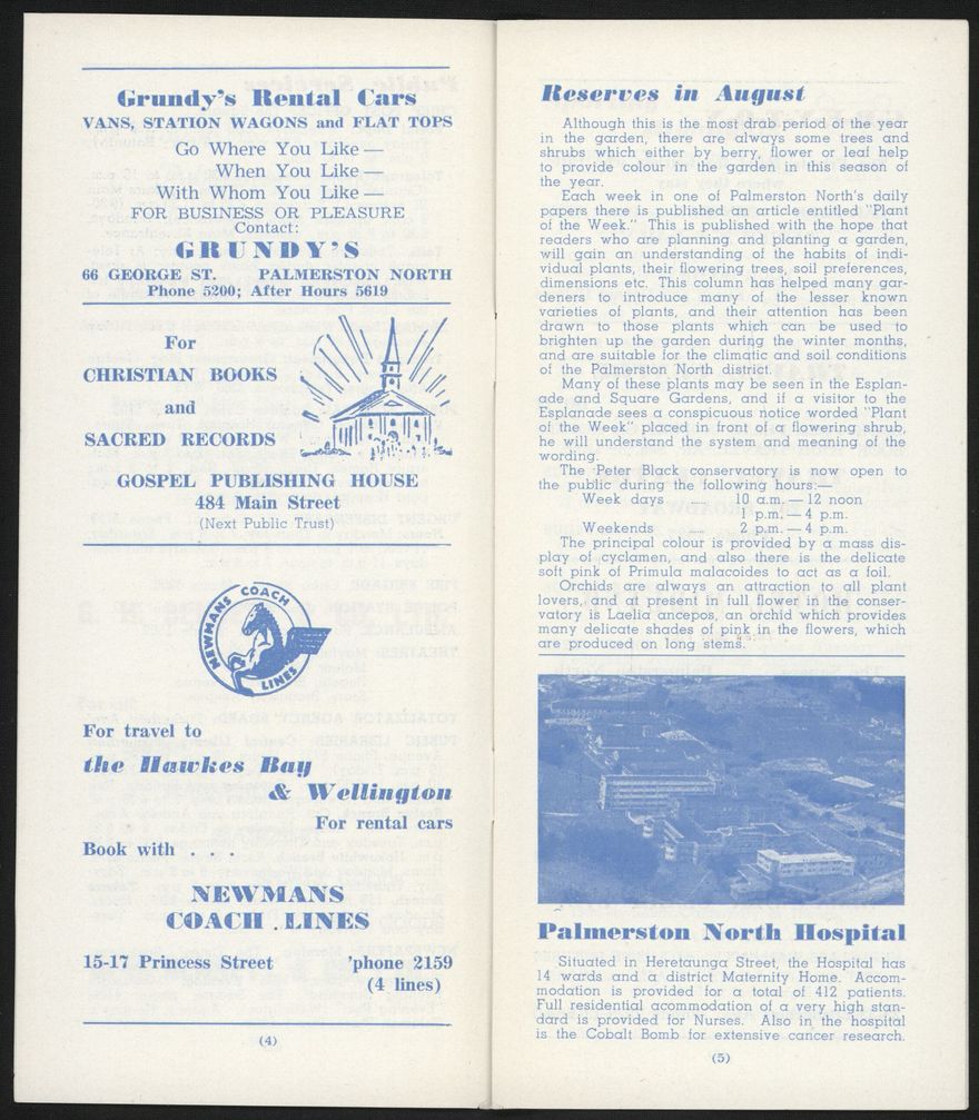 - An informational booklet published monthly by the Palmerston North Public Relations Organisation (Inc.) to provide information for visitors to Palmerston North and Feilding. Includes statistics about infrastructure and demographics.