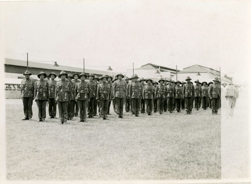 This image was taken by Keith Collinson, of the family who owned the Collinson & Cunninghame's department store. He was a Sergeant based in the Records Department at the Palmerston North Showgrounds. The Māori Battalion trained at the Showgrounds from January to May of 1940. On the back of the photograph Keith wrote, “Māori Battalion Parade at the Palmerston North Showgrounds. Tall building at right, lost in Ordnance Fire, midnight New Year’s Eve.” The fire was in 1945.