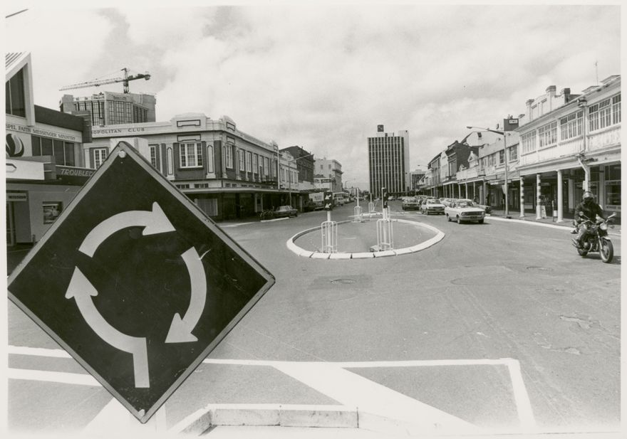 Egg shaped roundabout at the intersection of George and Cuba Streets.