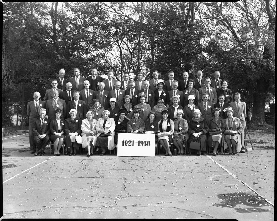 A group of about fifty former students attend the Linton School Jubilee. This negative comes from the Elmar Collection - a large series of semi-identified and unidentified images from the 1930s-1970s.